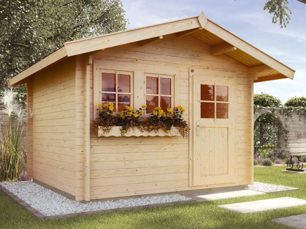 Als der Klassiker unter den Gartenhäusern verfügt ein Blockbohlenhaus über eine sehr robuste Bauweise, gepaart mit einer besonderen, natürlichen Ästhetik. Dabei orientiert sich die Bohlenbauweise an der traditionellen Blockhütte. Die Wände setzen sich aus vorgefertigten Holzbohlen zusammen, die dank einer Nut- und Feder-Verbindung ohne größere Anstrengungen aufeinander gesteckt werden können. Damit ist ein einfacher und schneller Auf- und Abbau garantiert. An der Kopfseite des Gartenhauses sorgt die charakteristische Verkämmung (spezielle Einkerbungen im Holz) nicht nur für eine schöne Optik, sondern hält das ganze Konstrukt auch zusammen und macht es absolut wind- und wetterfest.