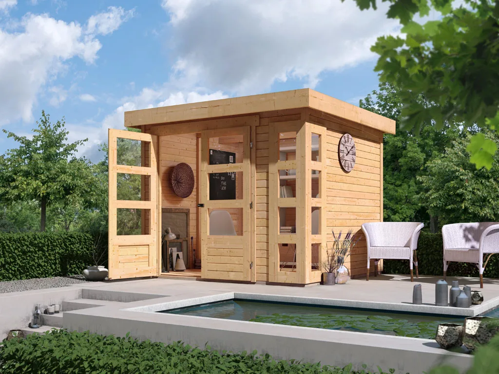Das naturbelassene Holz sorgt für ein natürliches und zeitloses Aussehen. Außerdem ermöglicht Dir das unbehandelte Holz, das Äußere des Gartenhauses ganz nach Deinen eigenen Wünschen zu gestalten.