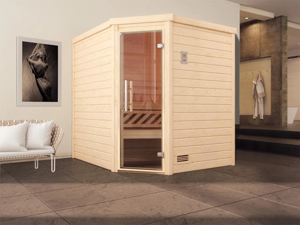 Die Premium Massivholzsauna mit 45 mm starken Blockbohlen sorgt für ein optimales Saunaklima und eine lange Lebensdauer. Die Blockbohlen sind mit Doppelnut und -feder ausgestattet und sorgen somit für eine hohe Stabilität und Dichte.