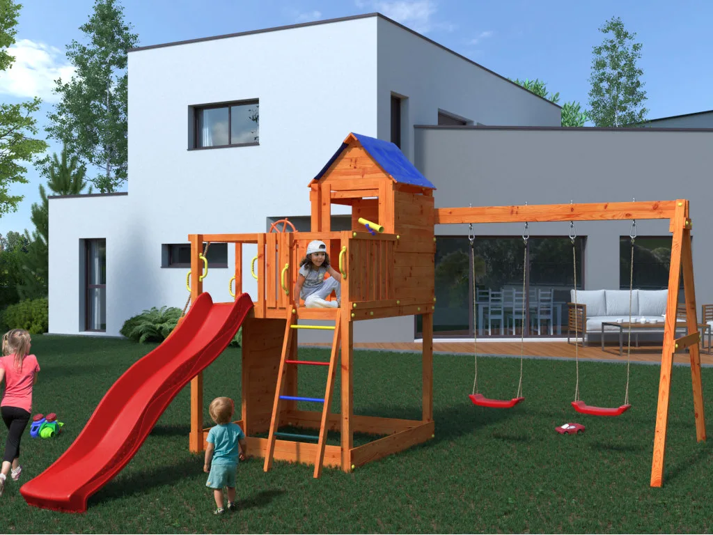 | Lieferumfang | Treehouse teak, Doppelschaukel, 2x Schaukelsitz rot, Podestanbau, Kletterwand, Klettersteine, Rampe mit Knotenseil, Leiter mit Metallsprossen, Sandkasten, Regal, Schraub-Abdeckkappen, 7x Haltegriffe, 6x Bodenanker, 1x Steuerrad, 1x Teleskop, 1x Rutsche |