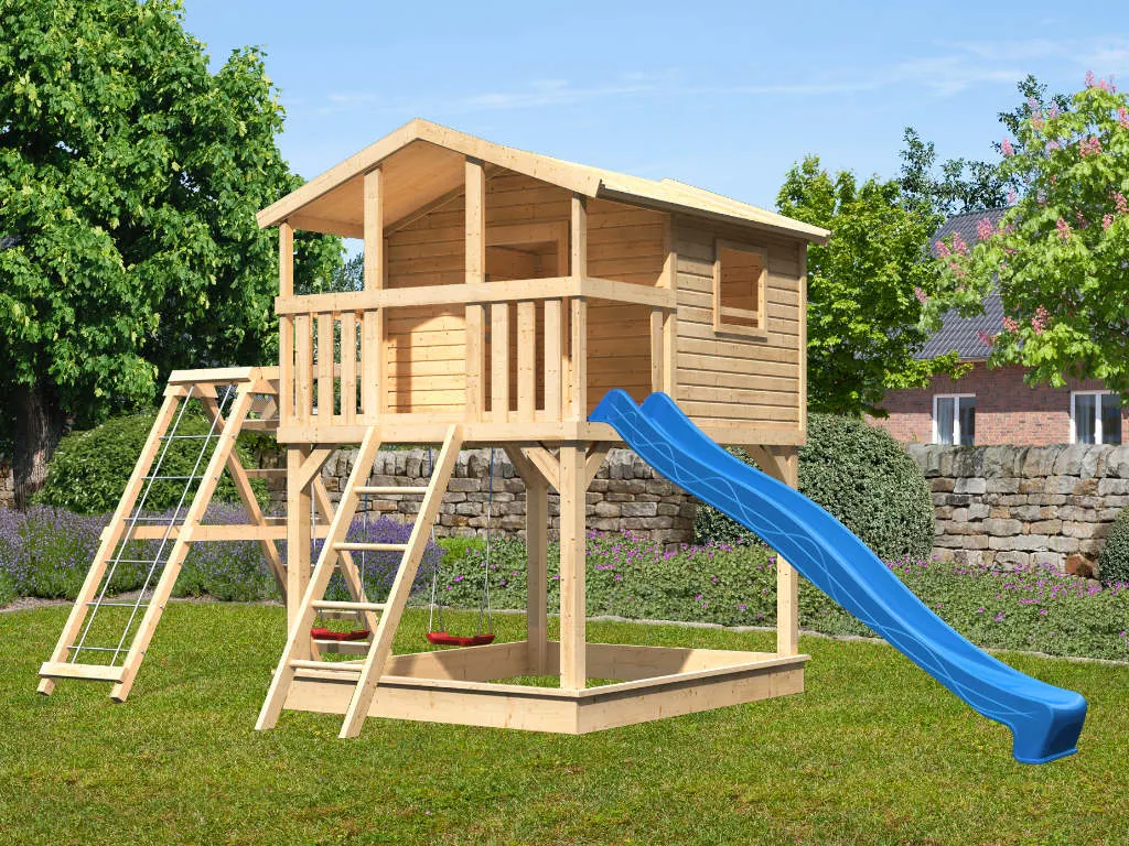 Nicht für Kinder unter 3 Jahren geeignet. Geeignet für Kinder von 3 bis 14 Jahren. Benutzung nur unter unmittelbarer Aufsicht von Erwachsenen. Stolper- und/oder Sturzgefahr. Nur für den häuslichen, privaten Bereich (DIN EN 71-8). Ausschließlich für die Verwendung im Freien. Spieltürme/Stelzenhäuser mit einer Spielhöhe von über 60 cm müssen auf einer weichen Unterlage wie Gras oder Holzspänen aufgestellt werden. Bei Spieltürmen/Stelzenhäusern mit einer Spielhöhe unter 60 cm wird eine weiche Unterlage ebenfalls empfohlen. Die Grundkonstruktion ist in regelmäßigen Abständen auf etwaige Beschädigung und Fäulnisbefall zu kontrollieren. Um die Stabilität zu gewährleisten, müssen die Pfosten im Boden verankert werden. Die Schraubverbindungen sind in regelmäßigen Abständen (ca. 4 Wochen, je nach Benutzungshäufigkeit und Alter des Spielgerätes) auf festen Sitz und Stabilität zu überprüfen. Die angegebenen Maße können geringfügig abweichen.
