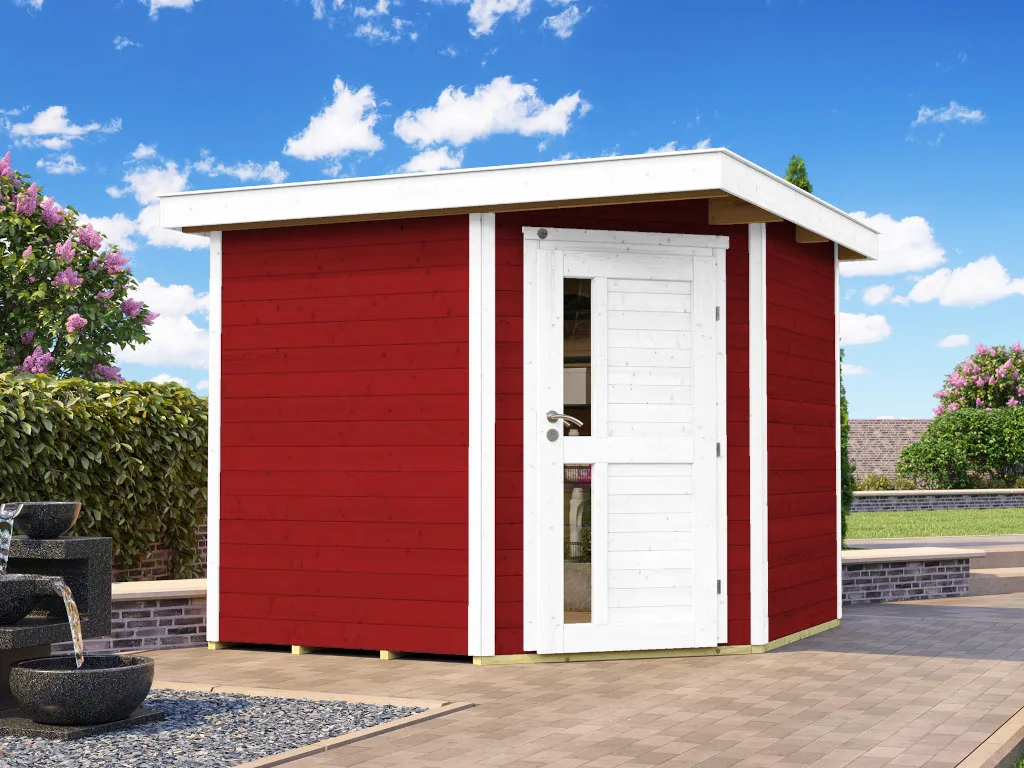 Die Grundfläche des Gartenhauses beträgt 5,62 m² mit einem Sockelmaß von B x T: 239 x 235 cm (B x T). Eine optimale Raumnutzung wird dank einer Firsthöhe von 217 cm gewährt.