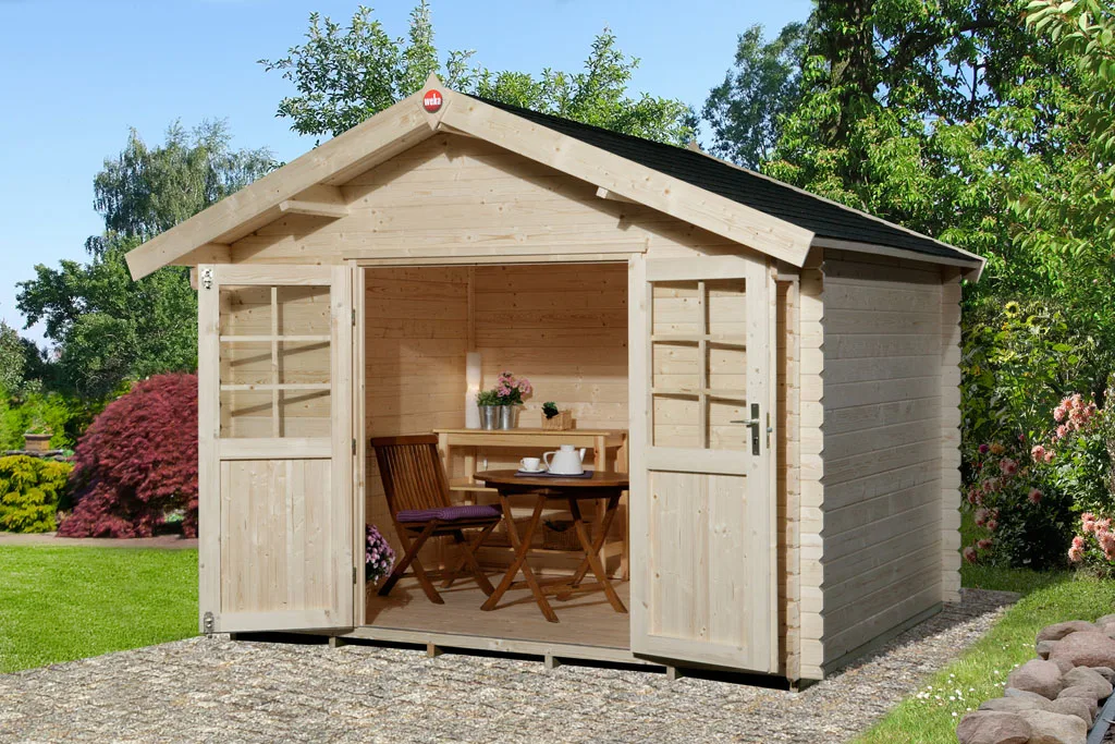 Als der Klassiker unter den Gartenhäusern verfügt ein Blockbohlenhaus über eine sehr robuste Bauweise, gepaart mit einer besonderen, natürlichen Ästhetik. Dabei orientiert sich die Bohlenbauweise an der traditionellen Blockhütte. Die Wände setzen sich aus vorgefertigten Holzbohlen zusammen, die dank einer Nut- und Feder-Verbindung ohne größere Anstrengungen aufeinander gesteckt werden können. Damit ist ein einfacher und schneller Auf- und Abbau garantiert. An der Kopfseite des Gartenhauses sorgt die charakteristische Verkämmung (spezielle Einkerbungen im Holz) nicht nur für eine schöne Optik, sondern hält das ganze Konstrukt auch zusammen und macht es absolut wind- und wetterfest.