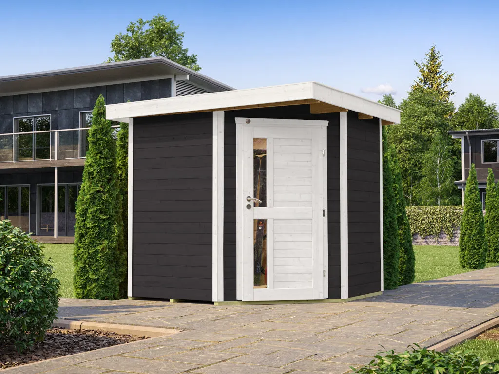 Die Grundfläche des Gartenhauses beträgt 4,28 m² mit einem Sockelmaß von B x T: 209 x 205 cm (B x T). Eine optimale Raumnutzung wird dank einer Firsthöhe von 217 cm gewährt.