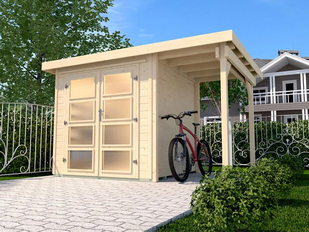 Für mehr Raum und vielfältige Nutzungsmöglichkeiten sorgt das Gartenhaus mit Anbaudach. Das großzügig geschnittene Anbaudach ermöglicht es, den Gartenalltag in vollen Zügen im Freien genießen zu können – geschützt vor Sonne, Wind und Regen. Der Platz unter dem Dach kann als gemütliche Terrasse zum Sitzen, Spielen oder Werkeln bei jedem Wetter genutzt werden. Alternativ eignet es sich auch als optimaler Unterstellplatz für zahlreiche Gartengeräte. Viel Platz für Dein Holz! Das Gartenhaus wird inklusive Kaminholzanbau mit Anbaudach geliefert. Mit der seitlichen Überdachung ist Dein Brennholz optimal vor Witterungseinflüssen geschützt und ordentlich gelagert.