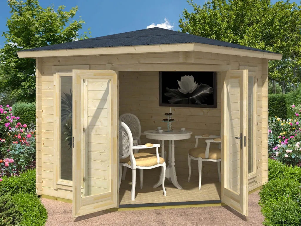 Als der Klassiker unter den Gartenhäusern verfügt ein Blockbohlenhaus über eine sehr robuste Bauweise, gepaart mit einer besonderen, natürlichen Ästhetik. Dabei orientiert sich die Bohlenbauweise an der traditionellen Blockhütte. Die Wände setzen sich aus vorgefertigten Holzbohlen zusammen, die dank einer Nut- und Feder-Verbindung ohne größere Anstrengungen aufeinander gesteckt werden können. Damit ist ein einfacher und schneller Auf- und Abbau garantiert. An der Kopfseite des Gartenhauses sorgt die charakteristische Verkämmung (spezielle Einkerbungen im Holz) nicht nur für eine schöne Optik, sondern hält das ganze Konstrukt auch zusammen und macht es absolut wind- und wetterfest.