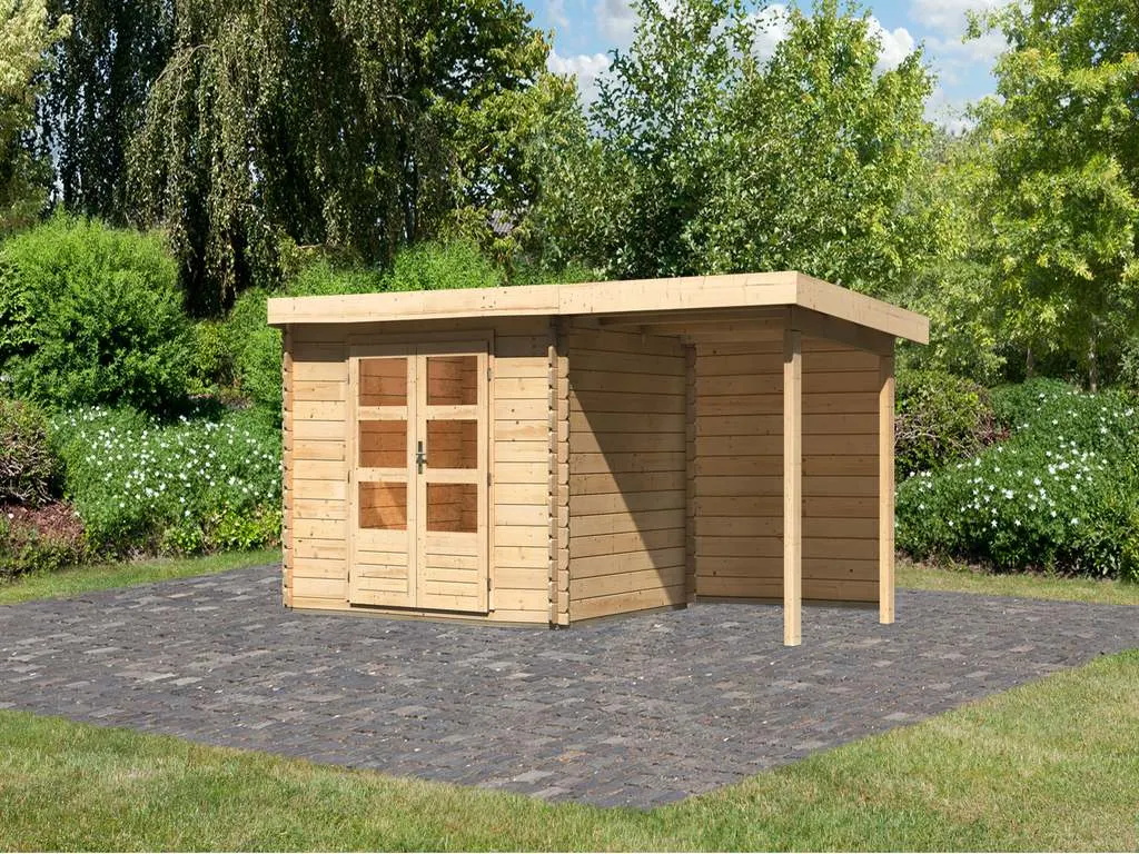 Das Gartenhaus mit Anbaudach und Rückwand ist sehr vielseitig. Der durch das Anbaudach geschaffene zusätzliche Stauraum eignet sich optimal als Lagerplatz für Gartenutensilien oder als Sitzbereich zum gemütlichen Verweilen. Dank Überdachung und integrierter Rückwand sind Geräte und Gartenmöbel optimal vor Wind und Wetter geschützt.