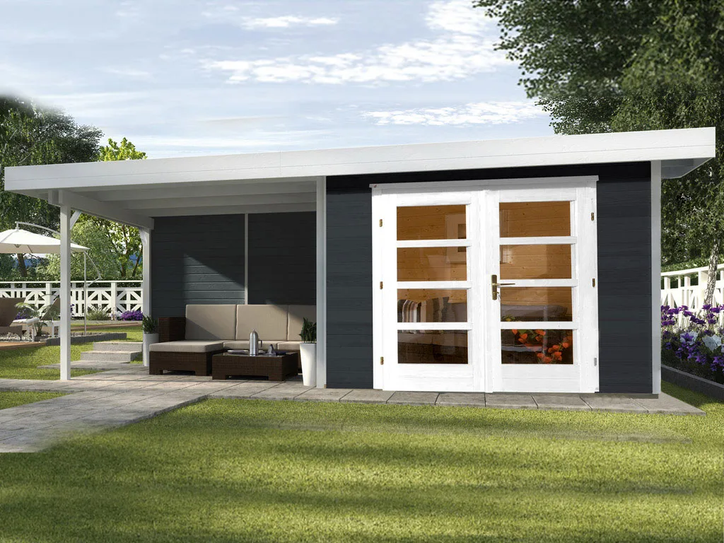 Für mehr Raum und vielfältige Nutzungsmöglichkeiten sorgt dieses Gartenhaus mit Anbaudach. Das großzügig geschnittene Anbaudach ermöglicht es, den Gartenalltag in vollen Zügen im Freien genießen zu können – geschützt vor Sonne, Wind und Regen. Der Platz unter dem Dach kann als gemütliche Terrasse zum Sitzen, Spielen oder Werkeln bei jedem Wetter genutzt werden. Alternativ eignet es sich auch als optimaler Unterstellplatz für zahlreiche Gartengeräte.