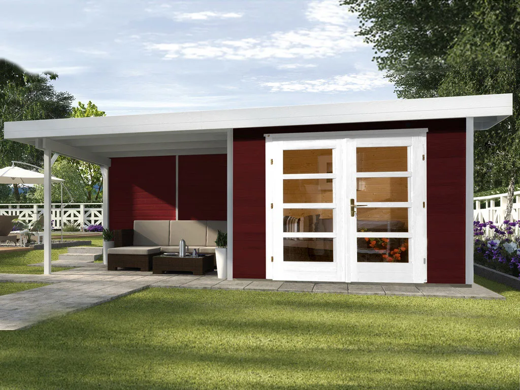 Für mehr Raum und vielfältige Nutzungsmöglichkeiten sorgt dieses Gartenhaus mit Anbaudach. Das großzügig geschnittene Anbaudach ermöglicht es, den Gartenalltag in vollen Zügen im Freien genießen zu können – geschützt vor Sonne, Wind und Regen. Der Platz unter dem Dach kann als gemütliche Terrasse zum Sitzen, Spielen oder Werkeln bei jedem Wetter genutzt werden. Alternativ eignet es sich auch als optimaler Unterstellplatz für zahlreiche Gartengeräte.
