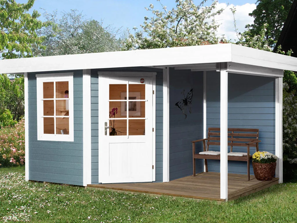 Die Kombination aus Holzlack und Holzlasur bei diesem Gartenhaus sorgt für optimalen Schutz gegen Witterungseinflüsse, Schädlinge und Schimmel und wertet das Haus optisch auf. So wird die Langlebigkeit des Holzes deutlich erhöht und die Freude am Gartenhaus verlängert.