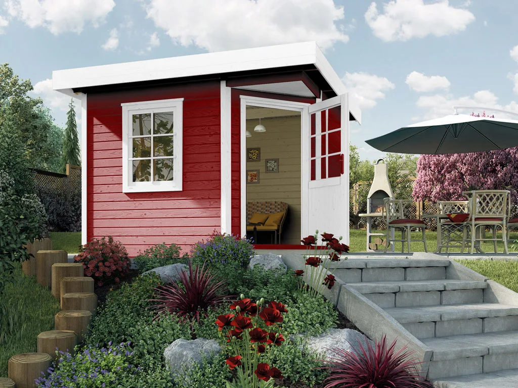 Die Kombination aus Holzlack und Holzlasur bei diesem Gartenhaus sorgt für optimalen Schutz gegen Witterungseinflüsse, Schädlinge und Schimmel und wertet das Haus optisch auf. So wird die Langlebigkeit des Holzes deutlich erhöht und die Freude am Gartenhaus verlängert.