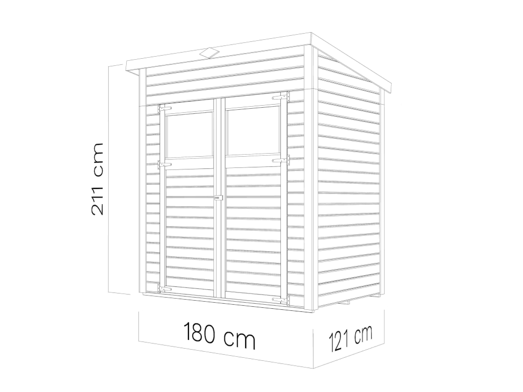 Die Grundfläche des Gartenhauses beträgt 2,16 m². Das Sockelmaß (Haus ohne Anbau) liegt bei 180 x 121 cm (B x T). Das Sockelmaß liegt bei 180 x 121 cm (B x T). Eine optimale Raumnutzung wird dank einer Firsthöhe von 211 cm gewährt.