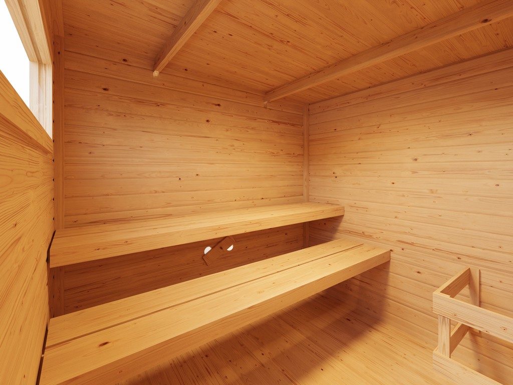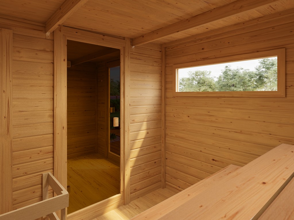 - Bodenrost aus fußwarmem Fichtenholz: für angenehmes Auftreten innerhalb und außerhalb der Sauna.