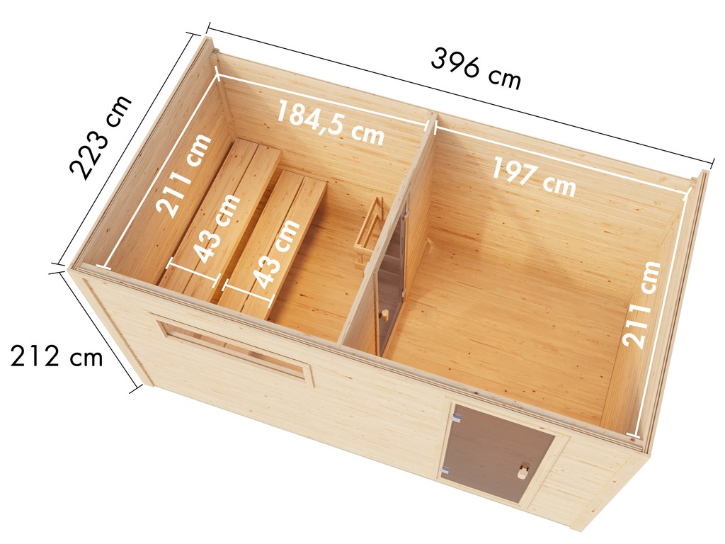 B x T x H: 396,1 x 224,9 x 212,4 cm, inkl. 2 Liegen, ohne Saunaofen