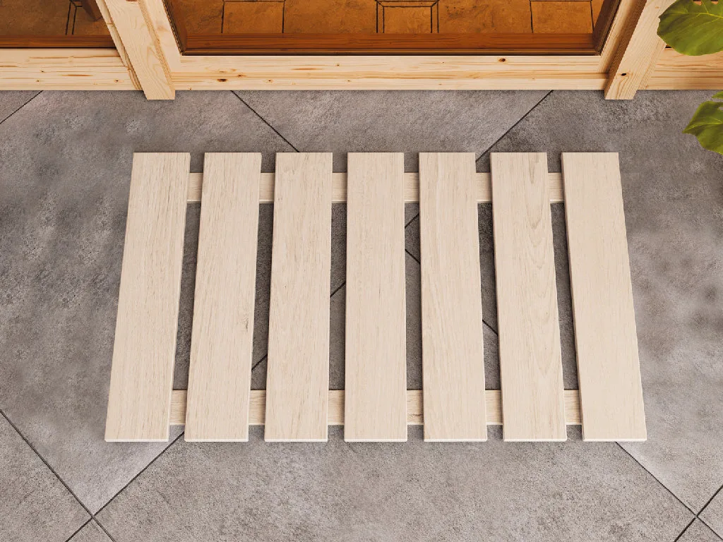 Der fußwarme Bodenrost sorgt für angenehmes Auftreten innerhalb und außerhalb der Sauna.