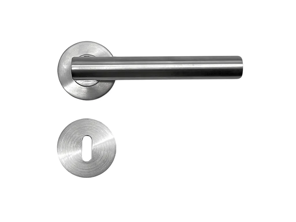 Drückergarnitur in Buntbartausführung mit gewölbtem L-Form-Griff und runden Klipprosetten, Edelstahl matt.
