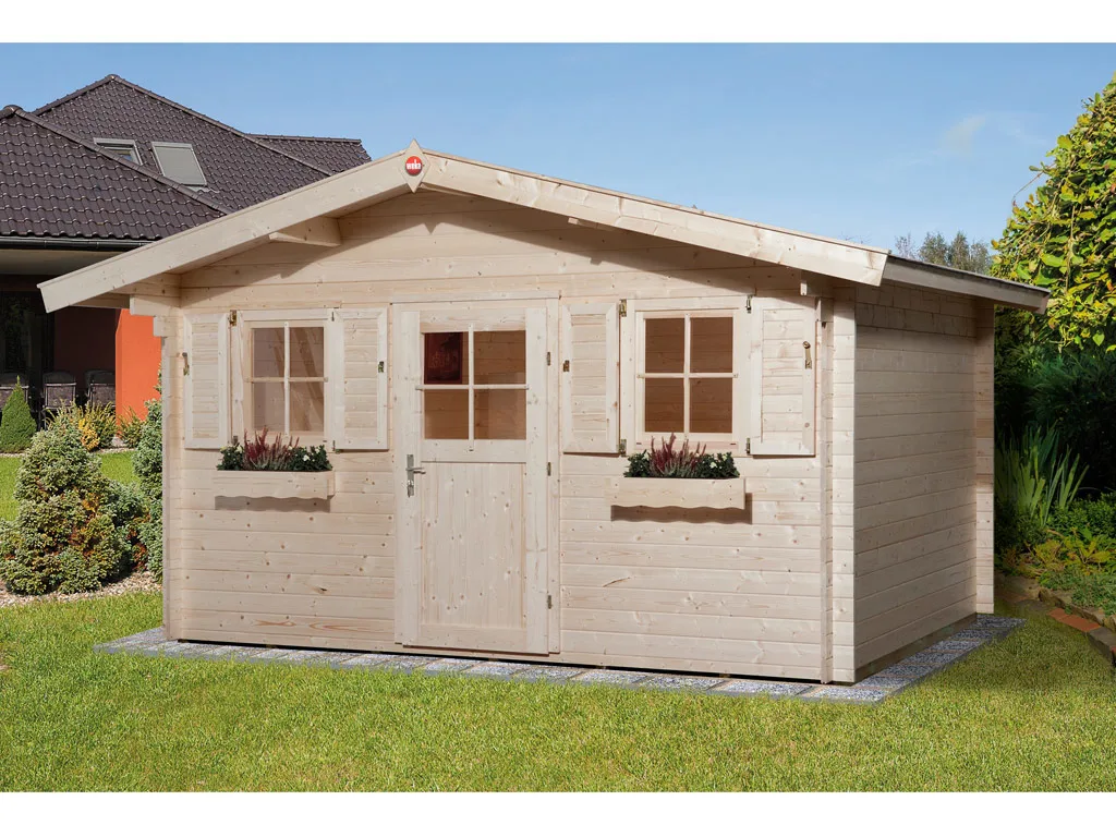 Die Grundfläche des Gartenhauses beträgt 14,44 m² mit einem Sockelmaß von 380 x 380 cm (B x T). Eine optimale Raumnutzung wird dank einer Firsthöhe von 262 cm gewährt.
