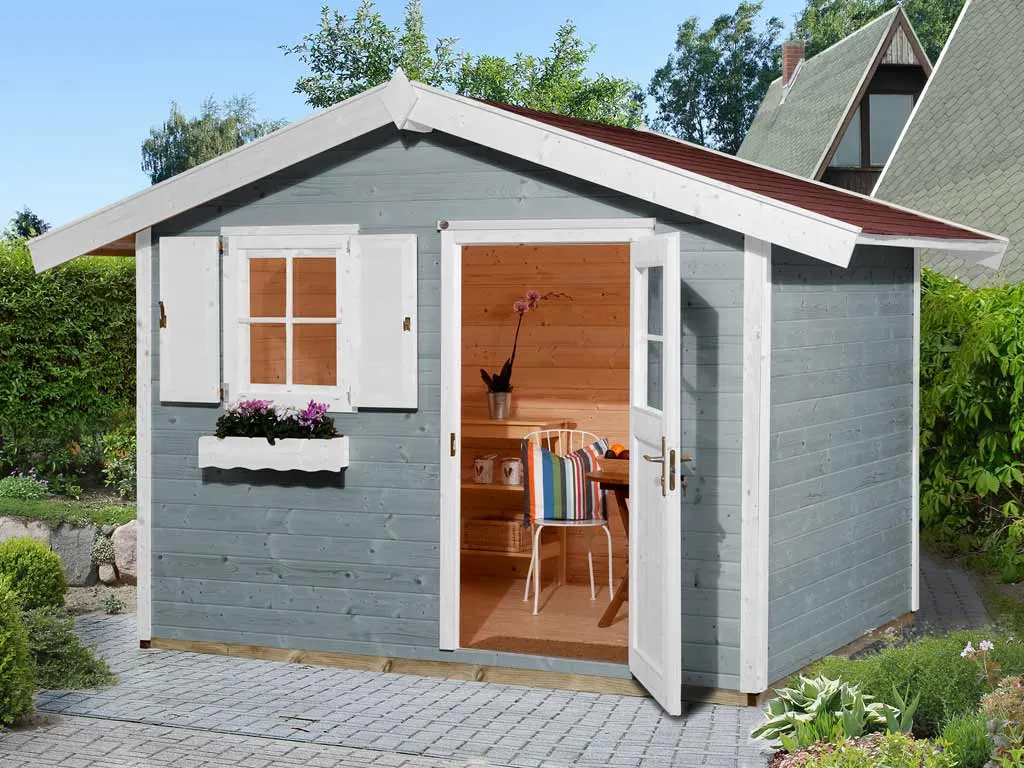 Setze ein farbiges Highlight in Deinem Garten. Dieses Gartenhaus überzeugt nicht nur durch seine Optik, der Holzschutzlack/-lasur in Grau schützt obendrein vor Schädlingen und Witterungseinflüssen und macht das Holz langlebiger und robuster. So ist auch nach längerer Zeit kein weiteres Streichen nötig.