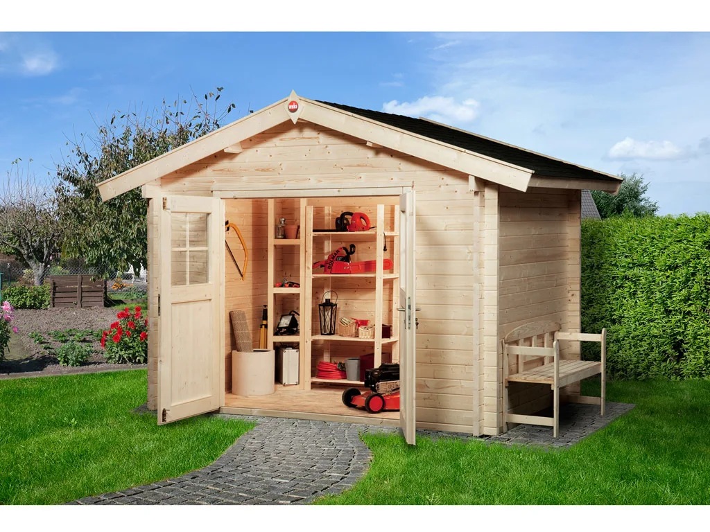 Als der Klassiker unter den Gartenhäusern verfügt ein Blockbohlenhaus über eine sehr robuste Bauweise, gepaart mit einer besonderen, natürlichen Ästhetik. Dabei orientiert sich die Bohlenbauweise an der traditionellen Blockhütte. Die Wände setzen sich aus vorgefertigten Holzbohlen zusammen, die dank einer Nut- und Feder-Verbindung ohne größere Anstrengungen aufeinander gesteckt werden können. Damit ist ein einfacher und schneller Auf- und Abbau garantiert. An der Kopfseite des Gartenhauses sorgt die charakteristische Verkämmung (spezielle Einkerbungen im Holz) nicht nur für eine schöne Optik, sondern hält das ganze Konstrukt auch zusammen und macht es absolut wind- und wetterfest.