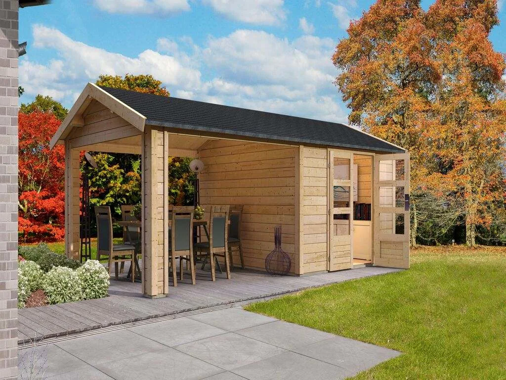 Das Gartenhaus wird aus 28 mm starken Wandbrettern aus nordischer Fichte im Steck-/Schraubsystem gefertigt und gewährleistet somit einen einfachen Aufbau und eine stabile Konstruktion. Das Satteldach besteht aus Massivholzdach.