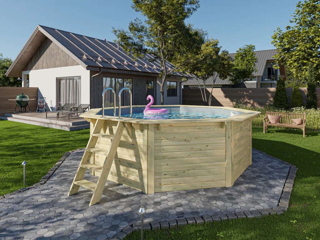 | Lieferumfang | Pool Modell X1, Terrasse, Leiter, Schutzvlies, graue Poolfolie, Skimmer, Rücklaufdüse und Schlauchpaket, Sandfilter, Pumpe und Quarzsand, Abdeckplane |