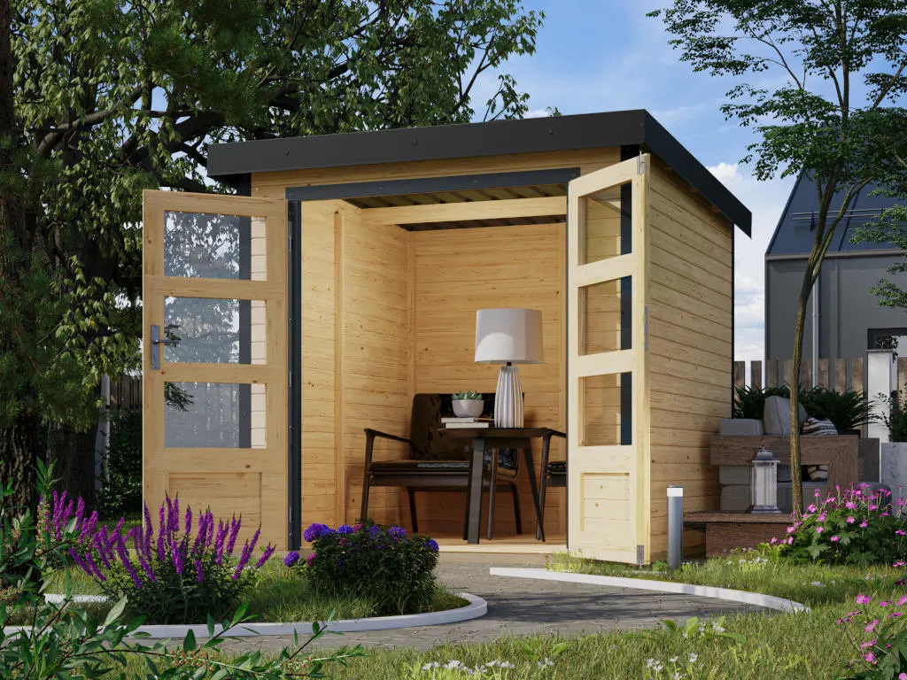 Dieses Hybrid-Gartenhaus vereint die Vorteile zweier Rohstoffwelten: Die Wände bestehen aus robustem Holz, an den Ecken und am Dach ist Metall eingesetzt. Das macht das Gartenhaus besonders langlebig, stabil und schützt zudem vor Witterungseinflüssen. Das moderne Design verleiht deinem Garten eine zeitgemäße Optik. Die Kombination aus Holz und Metallelementen ist ein echter Blickfang.