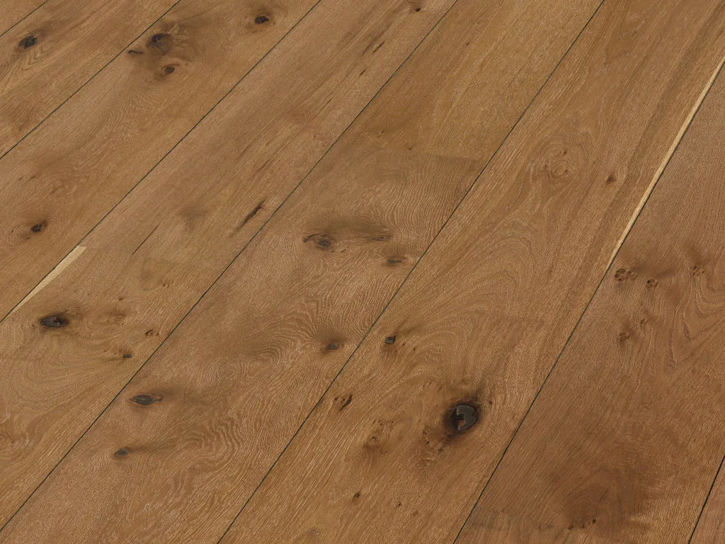 Das Holz der Eiche verleiht diesen Dielen einen urwüchsigen Charakter und schenkt allen Räumen stilvolle Wärme und Behaglichkeit. Neben seiner luxuriösen Optik ist Eichenholz relativ hart, aber dennoch trittelastisch.