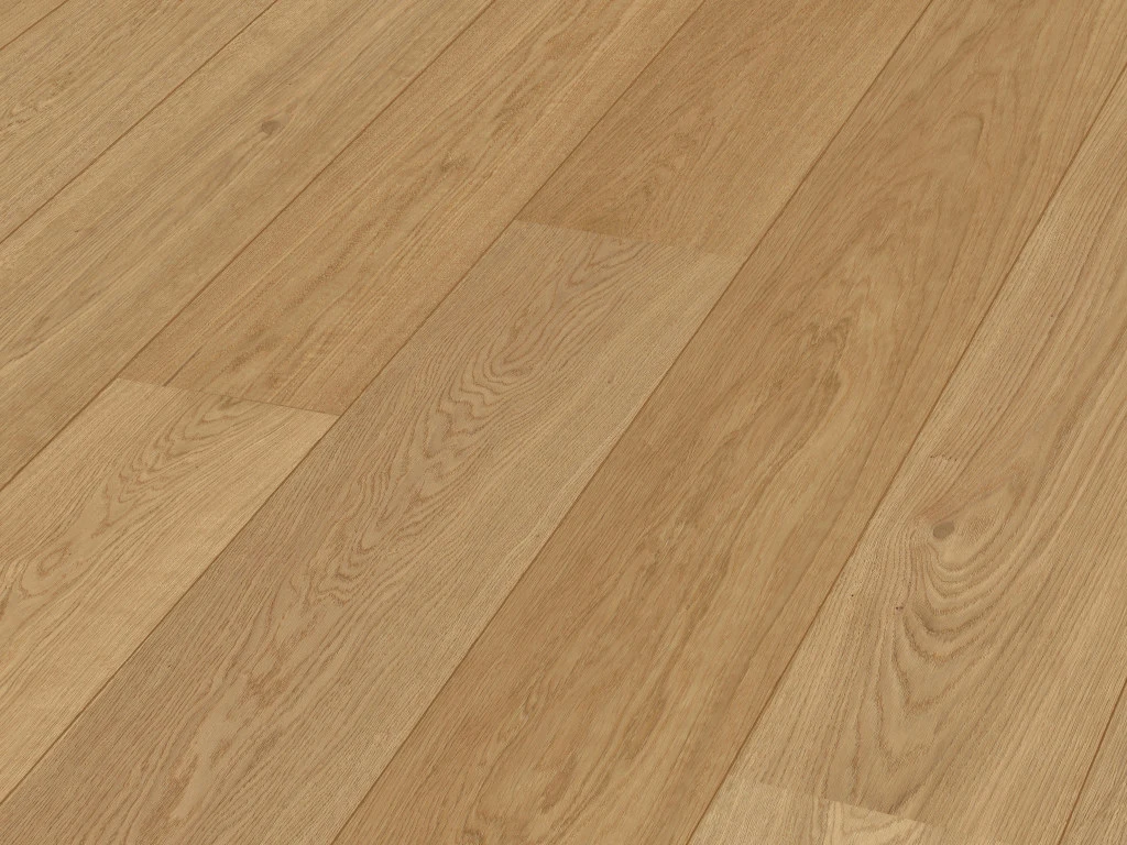 Dieser Boden aus Eichenholz stellt seine zeitlos schöne Wirkung unter Beweis – Echte Eiche spricht für sich selbst. Doch auch technisch kann Eiche punkten: aufgrund ihrer hohen Rohdichte wirkt diese Holzart besonders wärmeleitend und sorgt für stets warme Füße.