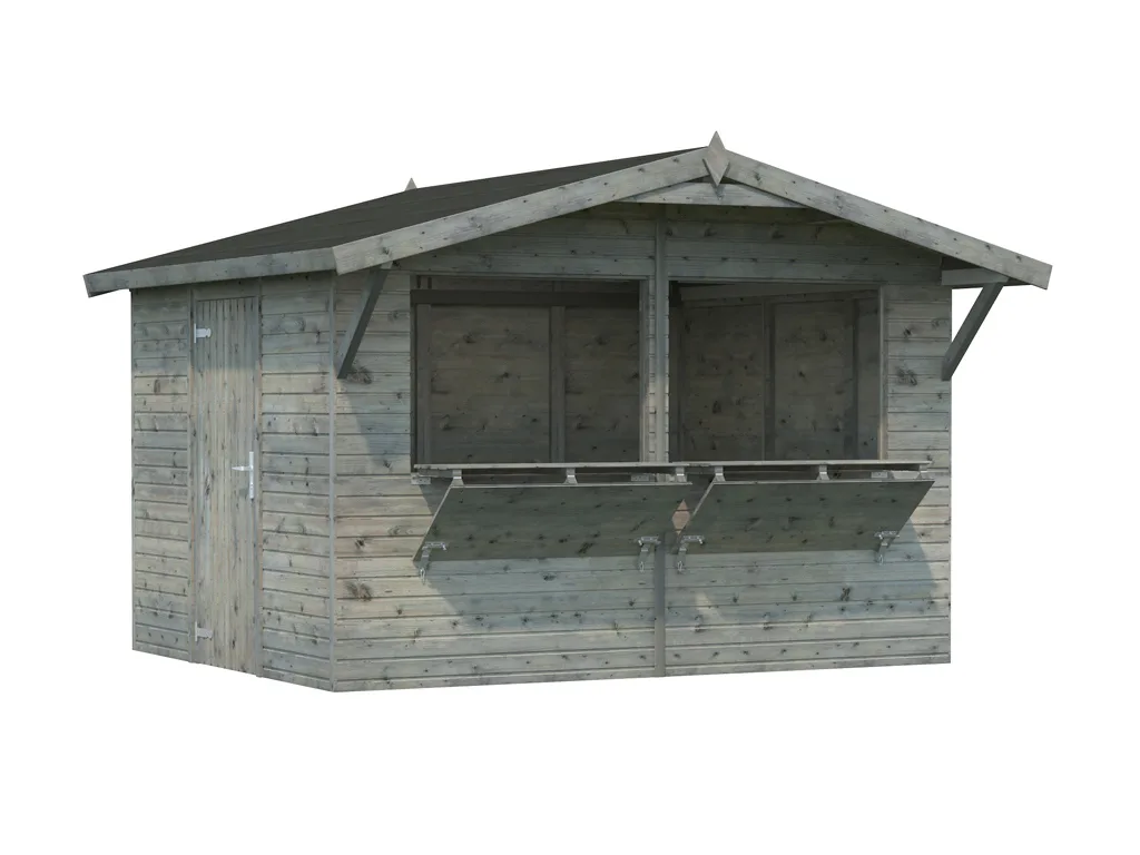 Große Verkaufsfläche Der 8,2 m² große Marktstand ist mit einem zweigeteilten Verkaufsfenster ausgestattet, das sich von innen mit einem Riegel verschließen lässt.
