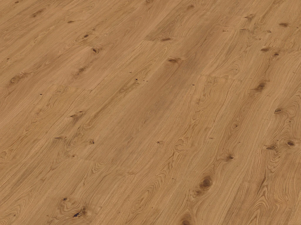 Dieser Boden aus Eichenholz stellt seine zeitlos schöne Wirkung unter Beweis – Echte Eiche spricht für sich selbst. Doch auch technisch kann Eiche punkten: aufgrund ihrer hohen Rohdichte wirkt diese Holzart besonders wärmeleitend und sorgt für stets warme Füße.