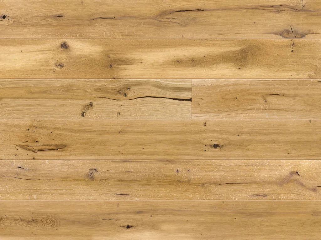 Von weicheren Holzschichten befreit, bildet das harte, stabile Kernholz der Diele eine fühlbar strukturierte, dreidimensionale und lebendig wirkende Oberfläche. Die Oberfläche der Dielen ist matt lackiert. Das sorgt für besondere Langlebigkeit und macht den Boden pflegeleicht.