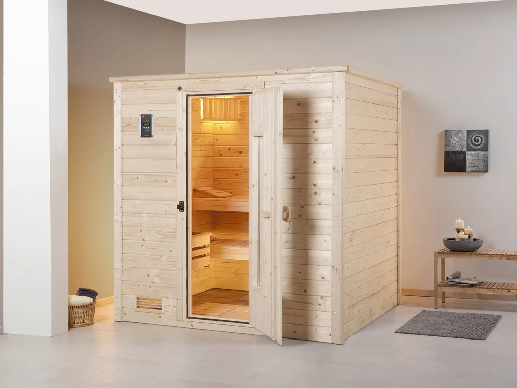 Sauna Massivholzsauna Bergen 1.8 HT isolierte Holztür mit Glasausschnitt