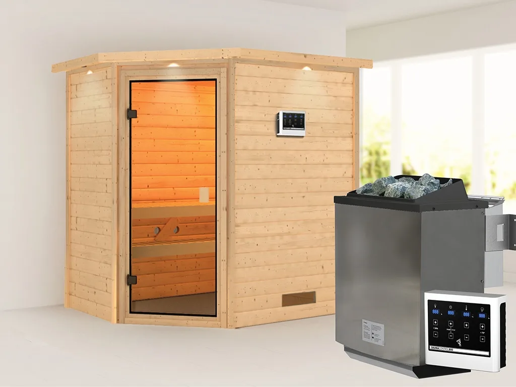 Sauna Massivholzsauna Jella mit Dachkranz, inkl. 9 kW Bio-Ofen mit externer Steuerung