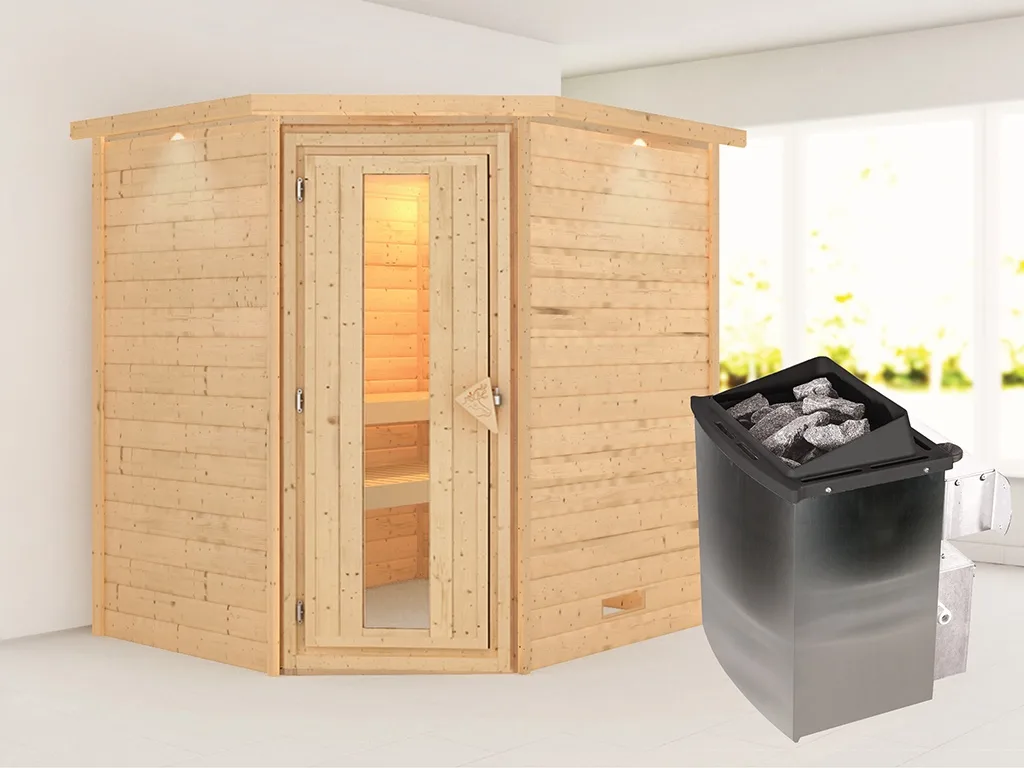 Sauna Massivholzsauna Mia mit Dachkranz, inkl. 9 kW Ofen mit integrierter Steuerung