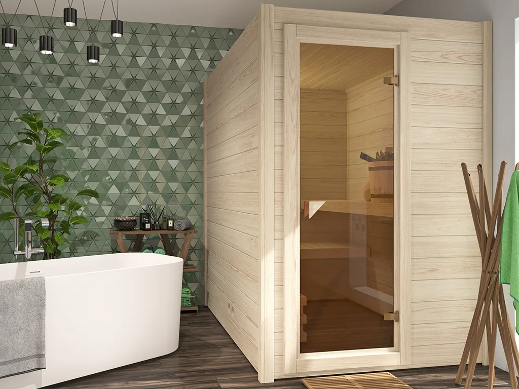 Dieses Saunamodell – eine System- bzw. Elementsauna – zeichnet sich durch seine besondere Sandwich-Bauweise aus, d. h., die Wandelemente bestehen aus einzelnen Schichten. Die bereits vorgefertigten Wandelemente aus Fichte ermöglichen einen schnellen Aufbau innerhalb weniger Stunden. Mit einer Wandstärke von 34 mm sind Systemsaunen optimal isoliert und somit besonders energiesparend. Wegen der sehr gut gedämmten Elemente heizt sich die Systemsauna extra schnell auf.