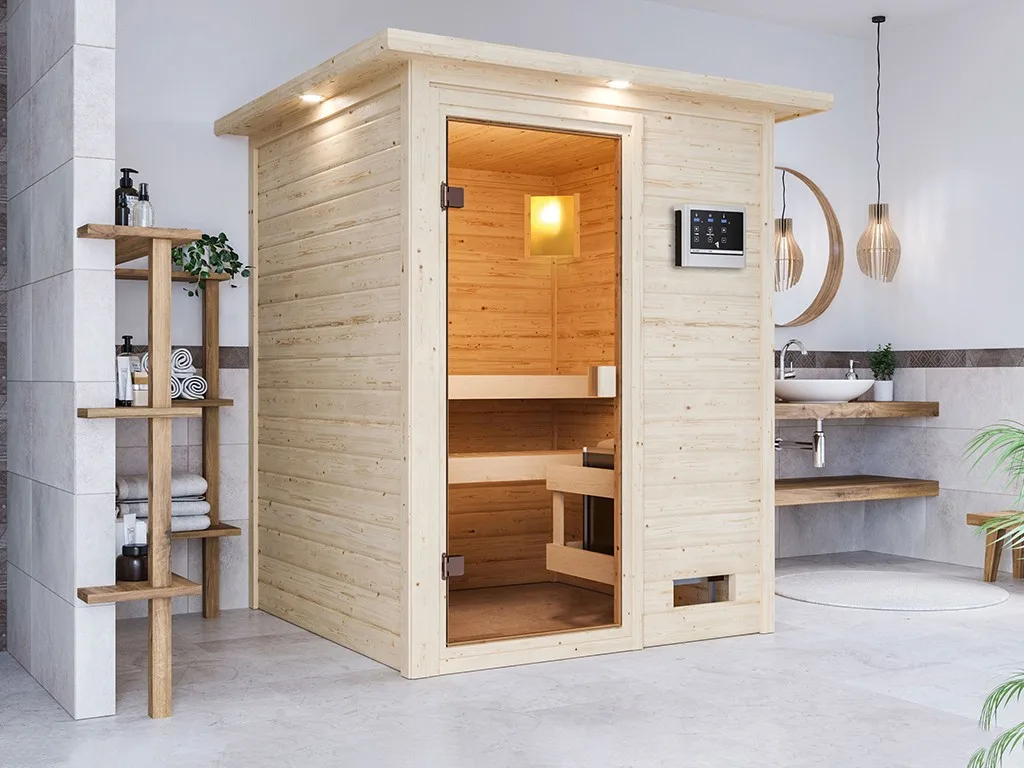 Sauna Massivholzsauna Sandra mit Dachkranz, inkl. 9 kW Ofen mit externer Steuerung