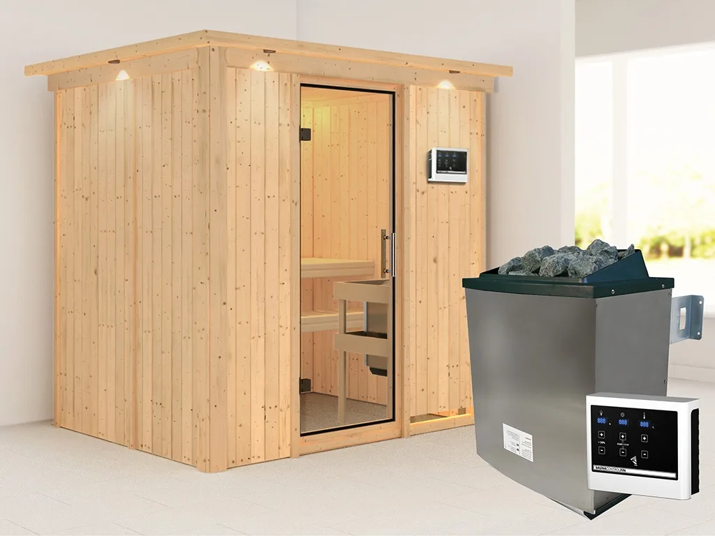 Sauna Systemsauna Bodin mit Dachkranz, inkl. 9 kW Ofen mit externer Steuerung