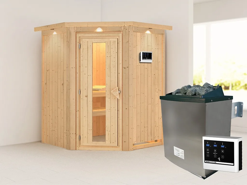 Sauna Systemsauna Larin mit Dachkranz, inkl. 9 kW Ofen mit externer Steuerung