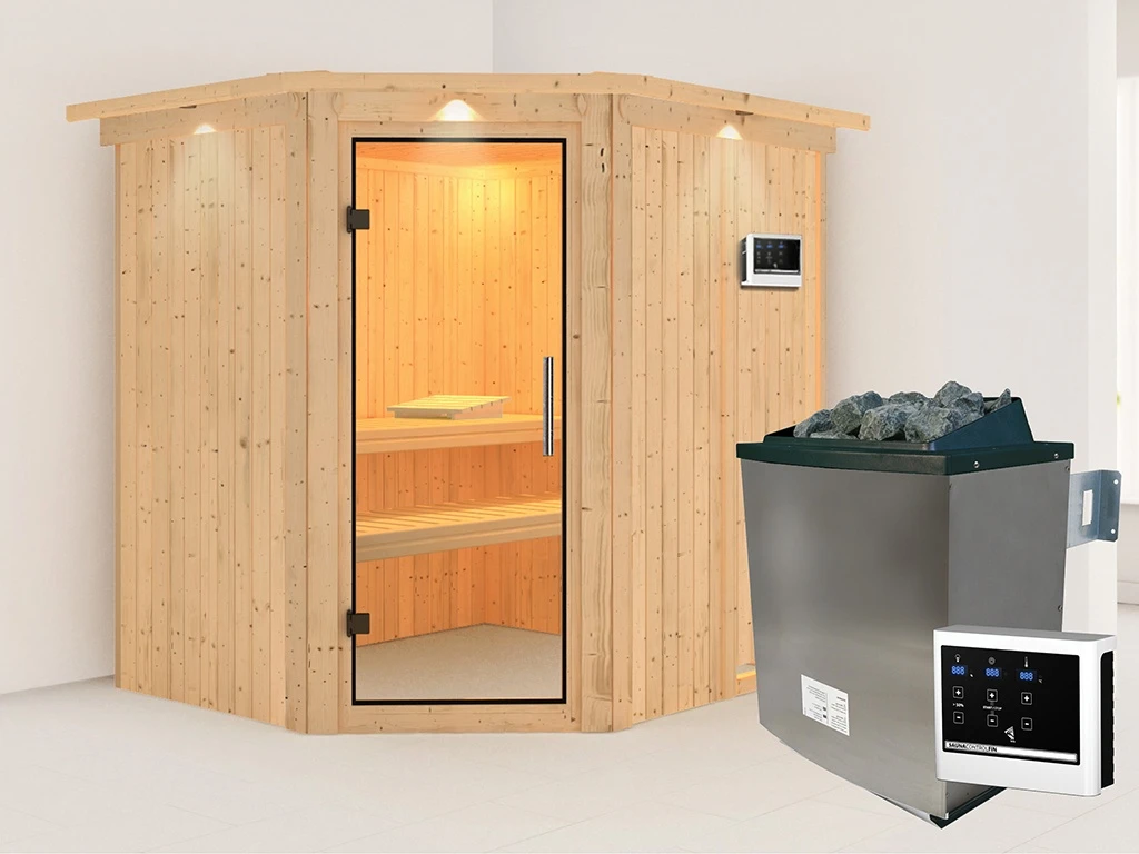 Sauna Systemsauna Siirin mit Dachkranz, inkl. 9 kW Ofen mit externer Steuerung