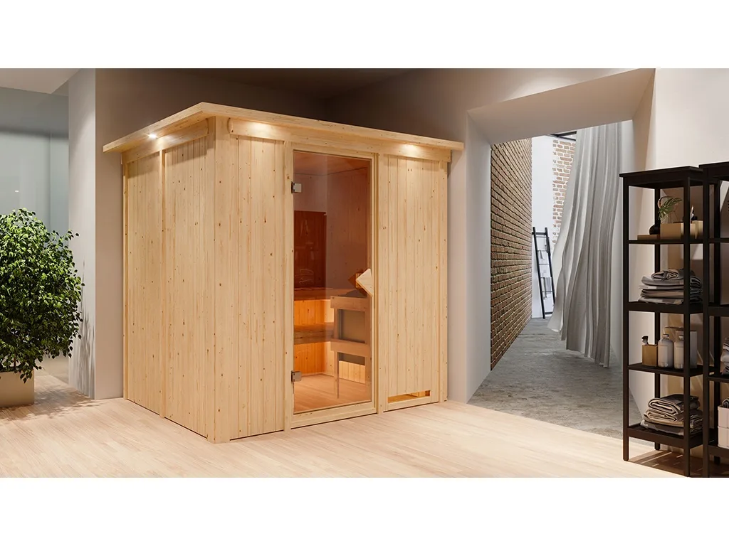 Sauna Systemsauna Sodin mit Dachkranz, inkl. 9 kW Ofen mit integrierter Steuerung