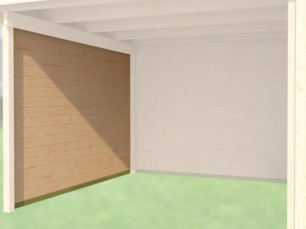 Ergänzen Sie Ihr Flachdachhaus Typ 126 und 172 mit Lounge durch eine 21 mm starke, naturbelassene Seitenwand aus massiven Blockbohlen. Die Wände bieten optimalen Schutz vor Wind und neugierigen Nachbarn.