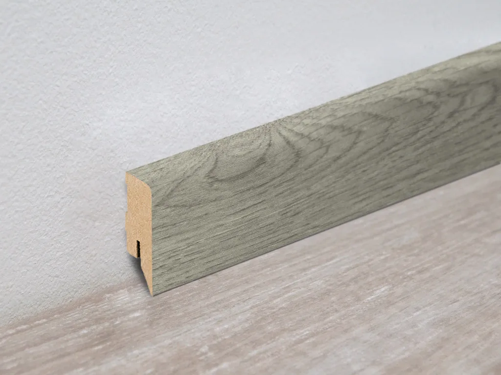 Folierte Sockelleiste mit stabilem MDF-Kern und ansprechendem Dekor.