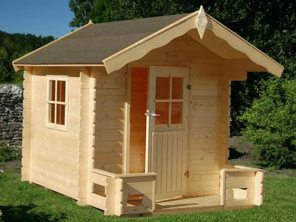 Das Spielhaus mit 19 mm starken Wänden wird inklusive einer kleinen Terrasse mit Brüstung geliefert