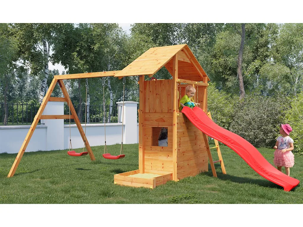 Spielturm SPARSET Smart 7 inkl. 2,28 m Rutsche rot, teakfarben