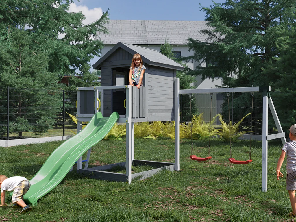 FUNGOO Spielturm Galaxy S grau/weiß inkl. Doppelschaukel + Rutsche grün