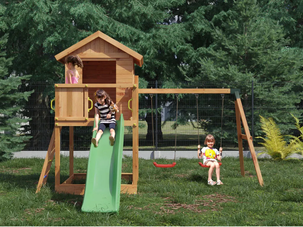 Spielturm mit Rutsche, Podest, Doppelschaukel und Leiter