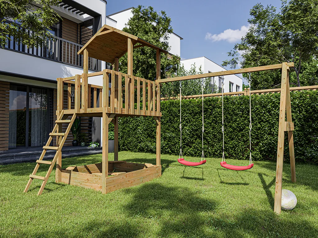 | Lieferumfang | Spielturm Tilly Classic KDI, Doppelschaukel (ohne Schaukelsitze), 4 Schaukelhaken, Sandkasten |