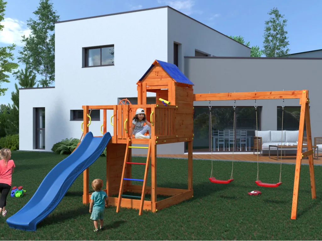 Spielturm Treehouse teakfarben inkl. Doppelschaukel + Rutsche
