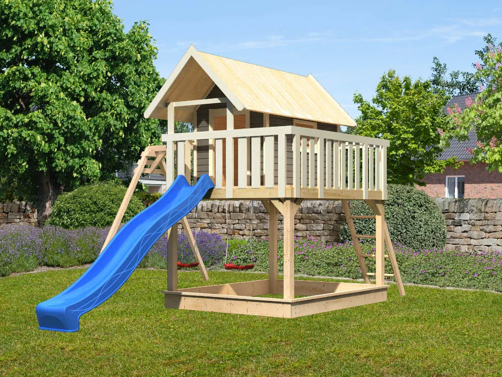 Material: Holz, B x T x H: 198 x 243 x 329,5 cm, inkl. Doppelschaukel, Wellenrutsche blau, Holzleiter