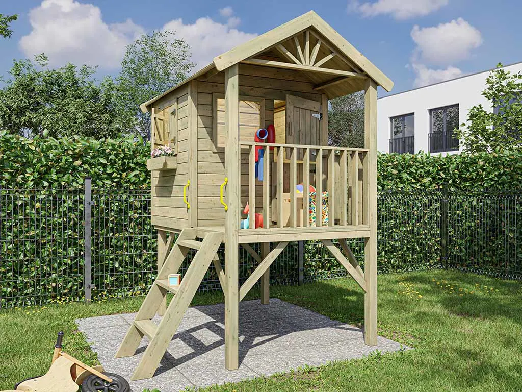 Das Stelzenhaus wird mit Einzeltür, 2 Fenstern, Treppe und einem Blumenkasten geliefert und sorgt für großes Spielvergnügen bei den Kindern.